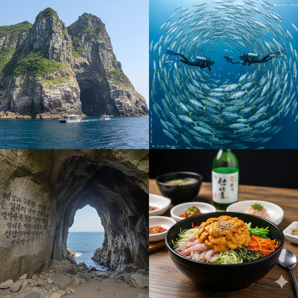 거제 바다에서 갓 건져 올린 싱싱한 **'성게비빔밥'**은 다이빙 후의 허기를 달래주는 최고의 보양식입니다. 바다 향 가득한 성게의 풍미는 지친 몸에 에너지를 즉각 공급해 주죠.